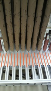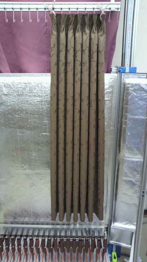 まず、カーテンをレールに引っ掛けてから裾をヒダ通りに固定。上下をピンっと張って上の写真のように機械の蓋をしめます。スタートするとセットした温度と時間まで熱風にて中が加熱します。
