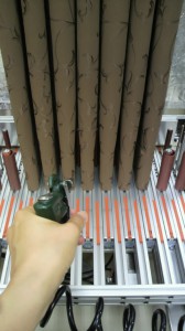 加熱が終わったらエアーガンで急速冷却することによりプリーツのくせがでるようにします。 髪の毛をセットするのと同じですね、暖めてから冷やすと、くせがつきやすいです。