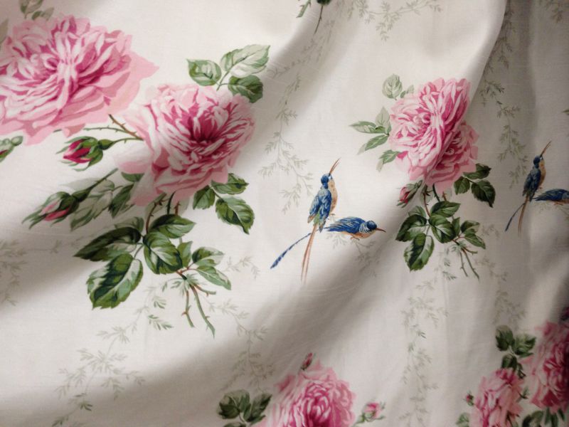 こちらの生地は、アスワンというメーカーのミュルーズ染織美術館のシリーズで、白地のジャガー織りにお花と小鳥のプリントの素敵なものでした。