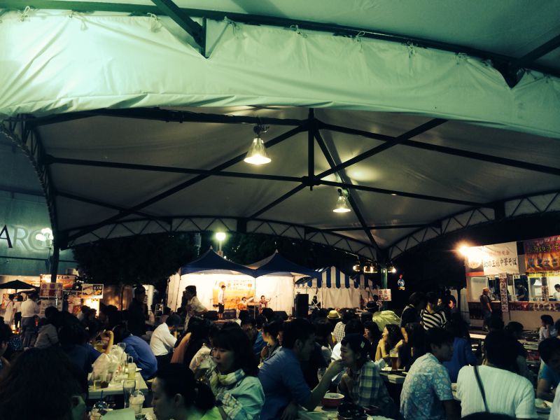 このイベントは『松本の食文化の発信』と、『地域が元気に』をテーマに、エンターテイメント溢れる野外レストランとして、毎年行われています。この日は平日でしたが、ほぼ席は埋まっていました。残念ながらこの日も天気は悪かったのですが、行った頃には雨は止んでおり、おいしくビールもいただけました