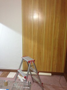 もともとの、木の板の壁の上から白い壁紙クロスを貼っていきます![]()