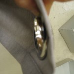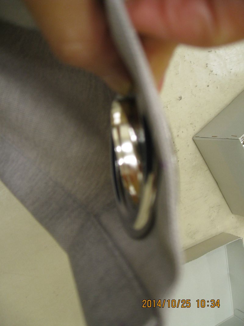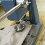 穴を開けたら今度はハトメ金具をとりつけます。生地をはさむように金具をつけて、器具のレバーを引いて金具をまげて固定させます。この作業、結構力がいります。まぁ、金属を曲げているので当たり前ですがね。