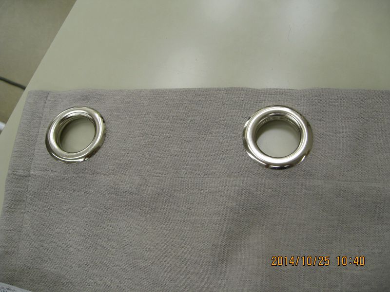 今日は、製作工程でハトメカーテンを紹介します。ハトメカーテンとは生地にポールを通す穴を開けて生地がほつれないように金具を打ち付けてあるカーテンです。穴は両耳を同じ方向に向ける為に必ず偶数個に開けます。カーテンの巾レールに対して大体1.3倍~1.8倍程の大きさでつくります。
