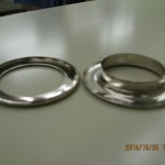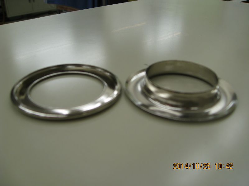 こちらがハトメ金具になります。右が生地の表側、左が生地の裏側から着け、右側の金具の出っ張った部分を曲げて裏側に取り付けた金具をはさみこむことで固定しています。こちらのハトメは外径が6cm内径が4cm。ゆうあい縫製所では在庫でシルバーとゴールドの2色をご用意できます。
