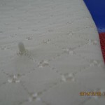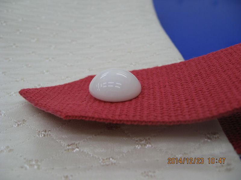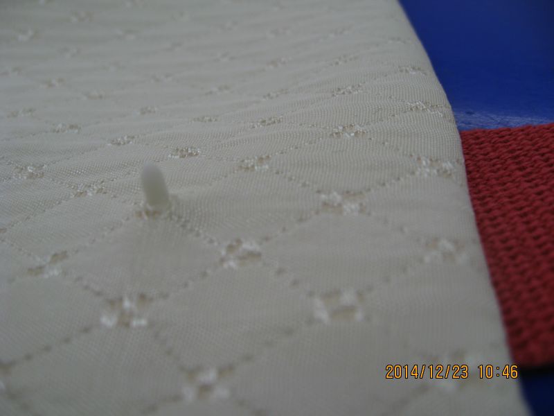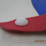 カーテン上部にタブをはさみこんで裏から左写真のとがっている方中写真のようにを刺します。目が詰まって生地が厚い場合はきりや目打ちで穴を開けます。右写真のようにしてタブを固定します。でも一応生地に穴を開けるのでタブをつけるところには芯地が入っているほうが丈夫で安心です。