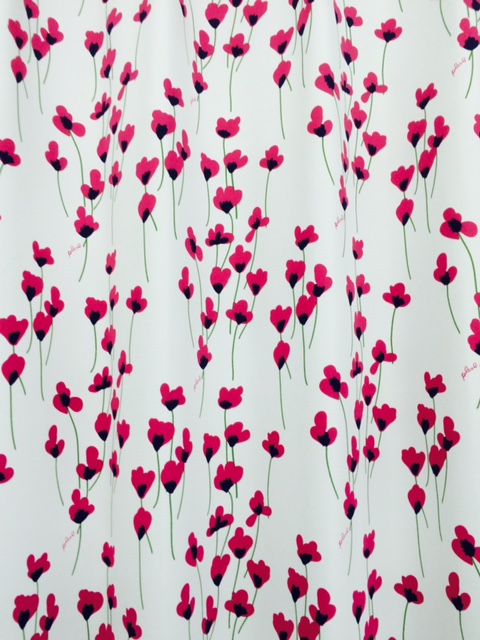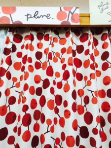 コンセプト通りにポップで可愛らしい柄ですね。展示サンプルは巾100cm、丈も掃出しサイズを展示しており、サンプルの貸し出しもしておりますので、実際のお部屋に当てていただくとイメージもわくと思います。これからは引越しシーズンにもなりますので是非カーテンでお部屋のテイストを作ってみてはどうでしょうか。