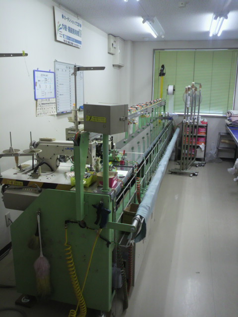 生地を置く所が3m程ありまして、生地を2枚重ねてセットするとミシンが動いて端をカットしながら縫って行きます。カットした部分は糸がロックしてるのでほつれることはありません。