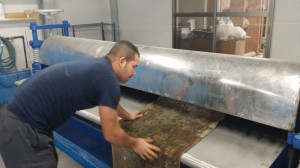 これが一番力をいります。なんせ脱水したとはいえ重さが半端無いですからね。特にウールの中国段通は重い・・・・・乾燥してても50kgくらいはあるので水分を含んでいて100kは超えています。