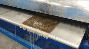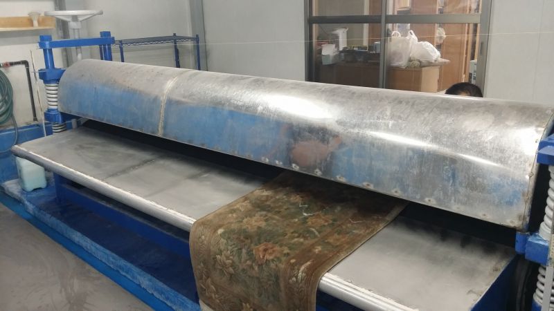 段通などの重い絨毯は基本は手洗いで床にデッキブラシ洗います。数人で水をかけながら専用洗剤で洗います。こちらのメーカーはより汚れが落ちるように水洗いをしていますが、