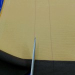 その後まず縦にのれん製作に必要な巾に切ります。ちなみにのれんを作る為には左右に分かれる生地のための縫い代が12cm必要になります。(片耳1.5cm巾で縫っています)上部の繋がる部分を縫って、両耳を4箇所縫います。耳を縫ってから上部の必要丈を裁断します。