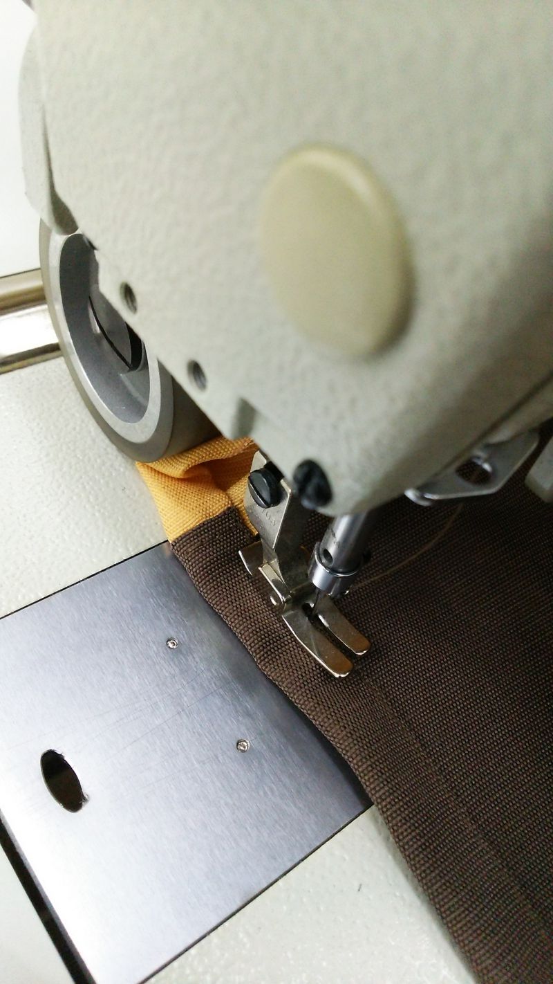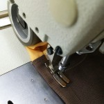 のれんを作る際には上部から作って行きます。上部ののれん棒の通し穴のはばは5cmで作っています。上部を縫ってからきちんとした丈を裁断機で決定して切り落とします。裾を縫って完成です。