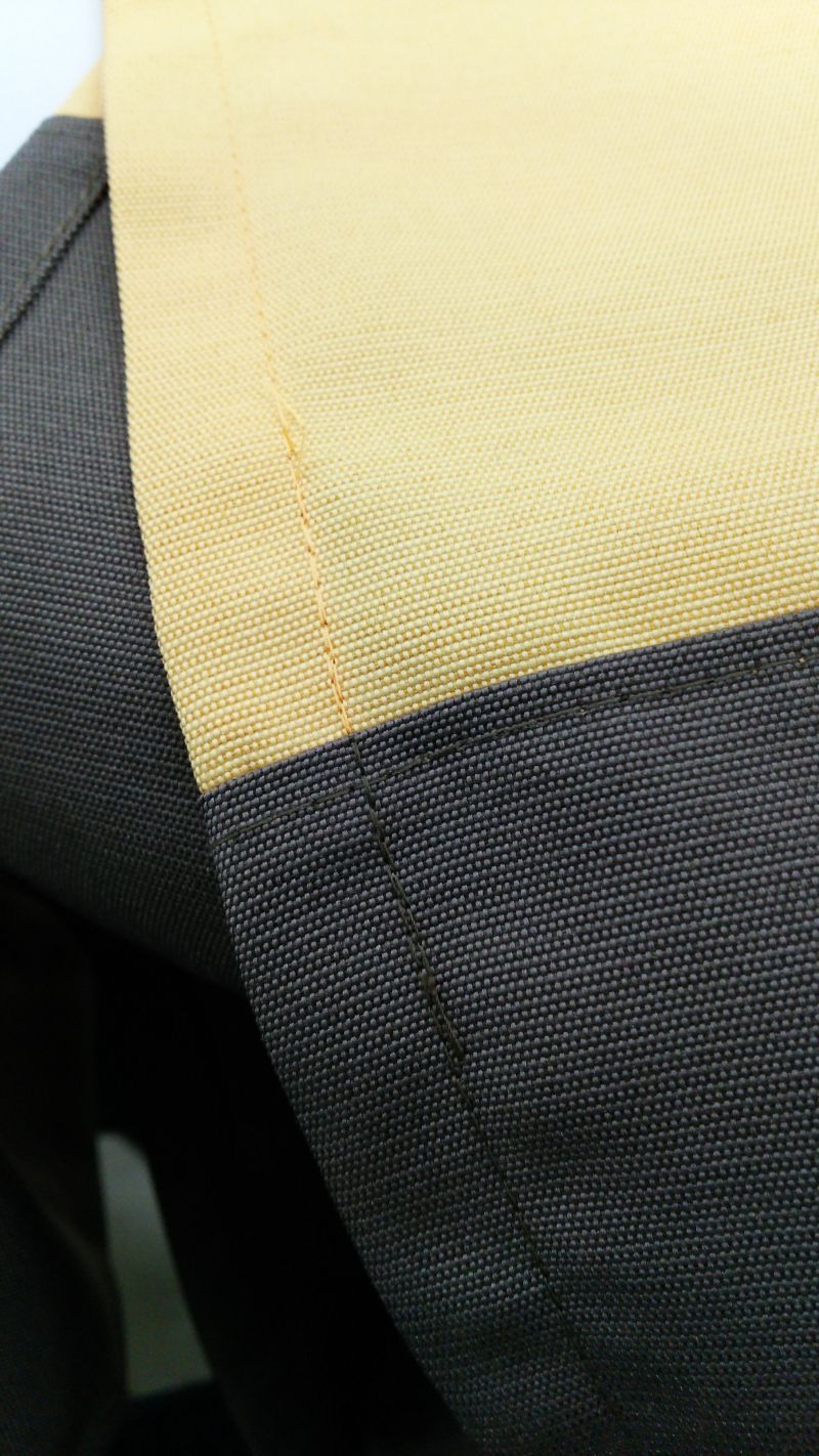 継ぎ合わせて作るボーダーの場合、ゆうあい縫製所では糸の色はそれぞれの生地に合わせて変えて、糸が目立たないようにしていますので生地のつなぎ目の近くは糸の返し縫がされています。