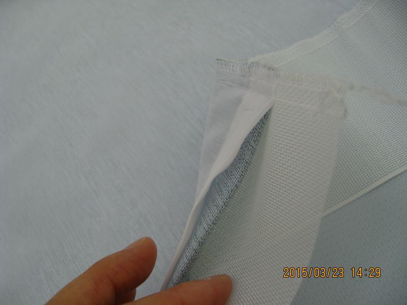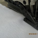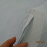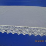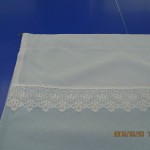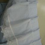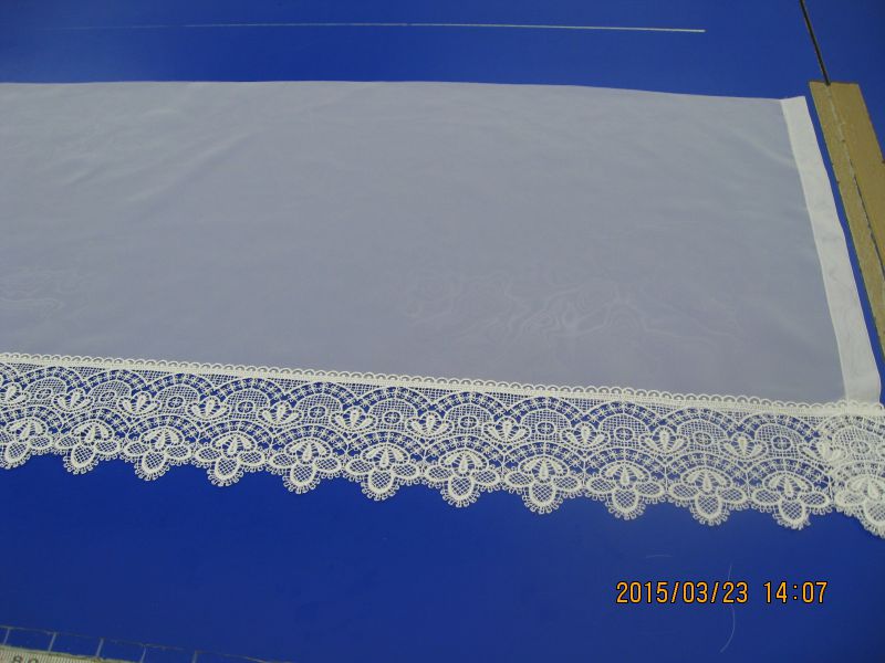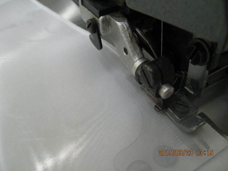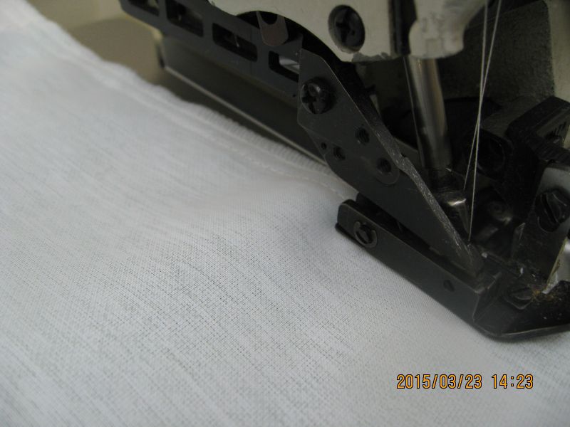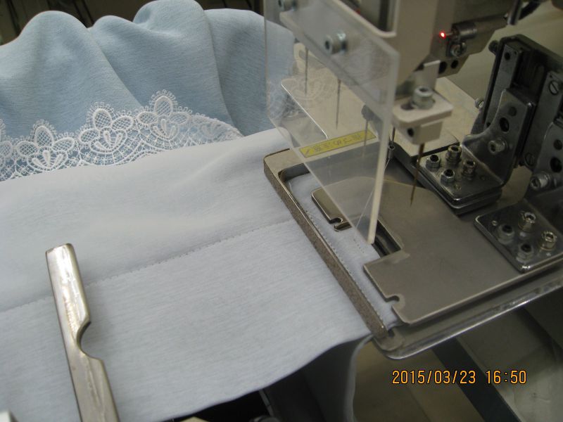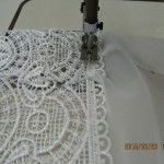 ボイルレース生地をカットした後、レース下部にまずメローロックを掛け糸がほつれない様にしてから本縫いミシンでトリムレースと合体させて縫い合わせて上部レース部分が出来上がります。