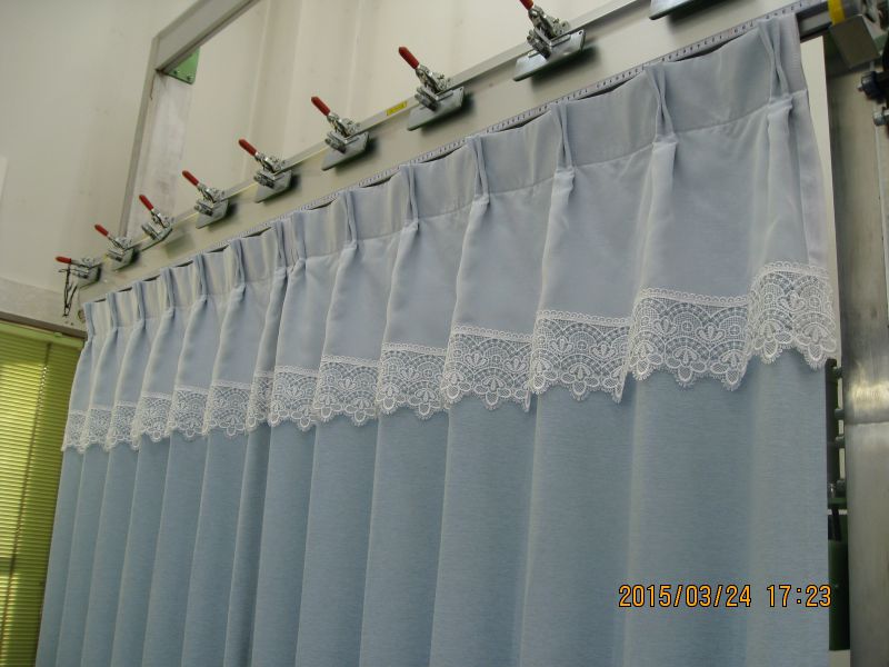 裾から製作していた厚地カーテンとレースを合わせて芯地と一緒に縫い合わせます。(写真ちょっとわかりずらいですね)