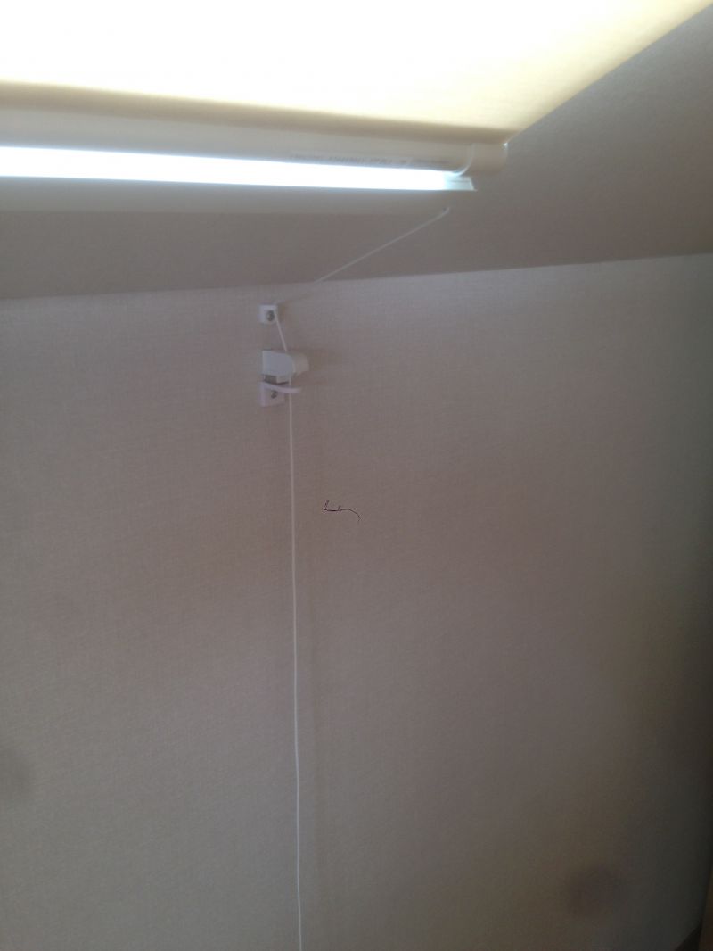 ④ロールスクリーンのガイドの役目をする両サイドのワイヤーを適度のテンションに張ります。 この適度が難しい・・・。確かに張りすぎると切れてしまうし、張りが弱いと垂れてしまうし。 もう少しメーカーの取り付け説明書に具体性が欲しいところです。 (これまた余談ですが、僕はギターを弾きますので、両サイドのワイヤーを弾いて同じ音にして張り具合を同じに調整しています)