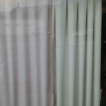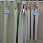 上の写真は店舗にあるサンプルですが、左写真はベージュの生地が裏地付カーテンでピンクが簡易裏地付です。表から見ると変わりはありません。右写真がそのカーテンを裏から取った写真です。裏地付カーテンは表生地と同じ生地幅で作っているのできれいにヒダがとれますが、簡易裏地はフラットカーテンをつけたような見た目になります。