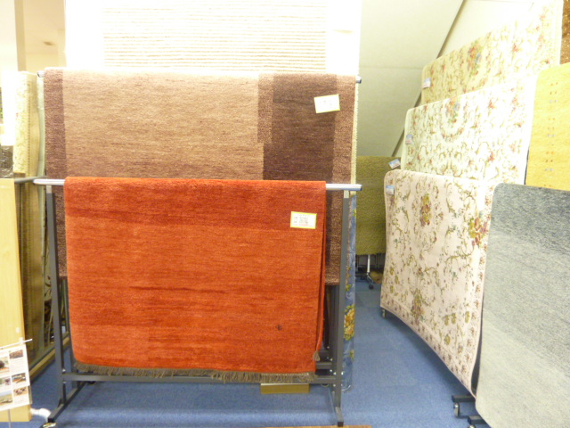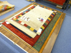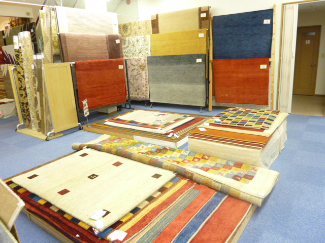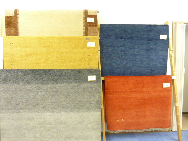 全体のギャベ、ギャッペコーナーの写真です。手織りのじゅうたんには力をいれております。その他にベルギーのカーペットなどは現物で100本以上は常時在庫を持っております。