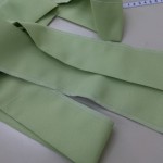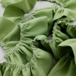 作り方は、まず薔薇の花のためのフリル生地を切り取ります。今回は7cmの高さを作るサイズで切りました。切り口をロックミシンで縫ったあと生地のギャザーを寄せる為に下部を縫い、糸を引っ張ってギャザーをつくります。これで花部分用の下準備ができました。