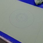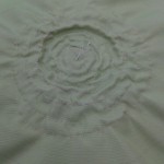 後は、クッションカバーの本体用に生地を切り取ります。(サンプルとしてなので、今回はファスナーを付けない簡単クッションカバーで作りました。)カバーの中心に印を付け、ある程度の円の線をチャコペンで描いておきます。薔薇の花の中心辺りは手縫いで整えてから手縫いで本体生地の中心に縫いつけてから、後はひたすら円の形に添ってミシンでフリルを縫いつけていきます。・・・右写真は縫いつけ終わった生地の裏側ですが、ボコボコですね。