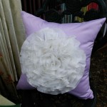右写真はクッションカバーを縫う際にギャザーを寄せたレース生地を一緒に縫いこんでみました。わりとかわいい感じに出来上がっているのではないかと・・