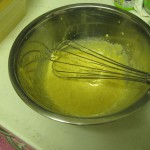 シフォンケーキはメレンゲをしっかり作れれば何とかなるので、メレンゲは電動泡立て器でちゃんと作り、卵黄・粉・バナナを混ぜ合わせた生地と合わせ型へ入れ暖めたオーブンで焼きます。焼いている間に洗い物。←お菓子作りは洗い物が多いですよね。