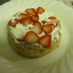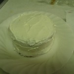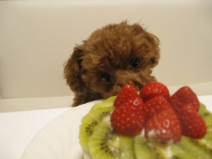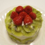 スポンジを半分に切ってちゃんと間にもクリームと苺をはさみ、ヨーグルトクリームを回りに塗って、苺・キウイを飾って、犬用クリスマスケーキが完成しました!