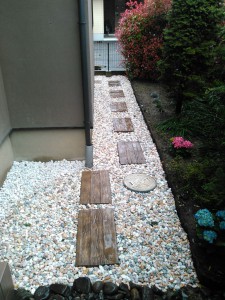 通路の土ならしをして砂利敷き。思いのほか重労働でした