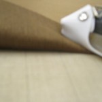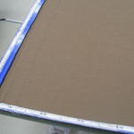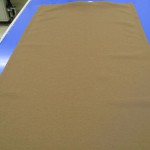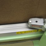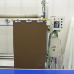リングテープ・上部マジックテープの縫いつけが終わったらアイロンをかけ裁断機に吊り下げ、ウエイトバーを入れる袋縫いの為の縫い代分をプラスして裁断します。縫い代分をアイロンで印つけミシンで縫います。この時ウエイトバーを入れる隙間を空けて縫います。一番下部にリングカンを引っ掛ける輪がないときはテープを縫い足します。これでWシェードの表地が縫い終わりました。