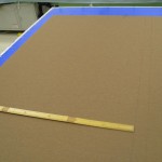 本日のシェードはゆうあいオリジナルシェードの厚地とレース生地がセットのダブルシェードの製作です。まず生地をまっすぐ広げ縦の線をチャコペンで2本引き外側を裁断。内側の線にそって折ながらアイロンをかけます。