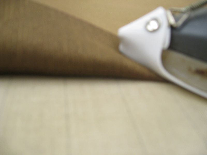 生地の上部を2.5cm程で折り返し(こちらもアイロンで印つけ)リングテープの縫いつけ作業になります。真ん中の写真はテープ縫い付け中です。必要本数のリングテープを縫いつけたら左写真で折り返したところにマジックテープ(メス)を縫いつけます。(現在シェードのリングテープ縫い付けは上部から縫い付けていますが、下部からの縫い付けのどちらでもまちがいではありません)