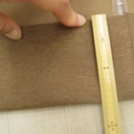 片方を折ったら、仕上がり幅プラス0.4mm程でチャコペンで線を引き、外側に縫い代分の線を引いたら裁断。先ほどと同じにアイロンで折り線をつけてから仕上がり幅を確認後に両側をミシンで縫います。両端を縫ったらアイロンをかけてから生地の上側を縦にたいして水平になるように裁断。・・右側の写真は生地を吊ってみてきちんと垂直におりているかチェックしています。