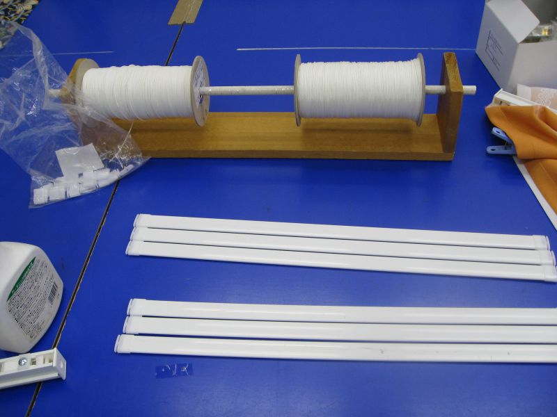 今日組み立てたのはゆうあいのオリジナルシェードのダブルシェードになります。ダブルシェードは厚地生地とレースが一緒についているシェードになります。・・上の写真はこちらシェードの組み立てに必要な部品です。左写真はコードストッパーとコードガイド。中写真はウエイトバーとシェード用コード。右写真はシェードレールになります。シェードレールにコードガイドとコードストッパーをはめます。