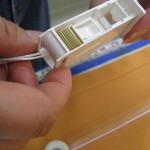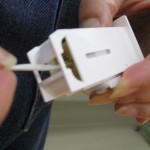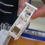 レール部分の部品に紐を通したらイコライザーという部品で紐をまとめ、シェード下部には脱着パーツという部品をつけます。(中写真)・・この脱着パーツ引っ張ると部品が外れるようになっていまして誤ってお子様などがシェードの操作コードに絡まってしまって事故が起こらないようになっています。シェードの表地、裏地それぞれ同じ作業をして組み立てがおわります。 最後に組みあがったシェードをシェードを引っ掛けて生地の上げ下ろしを試し、使用した部品が大丈夫か、シェード生地の汚れ・傷はないか、生地はまっすぐ垂直に降りているかを確認してシェードを折りたたみます。