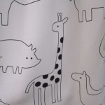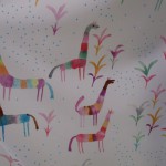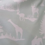 サファリという名前の生地でゾウ、キリン、シカのシルエットが描かれています。色はホワイト、ベージュ、ブルーの3色です。