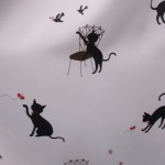 チョウやトリを追いかけているネコのシルエットがかわいいデザインの生地です。色はピンクとアイボリーの2色です。