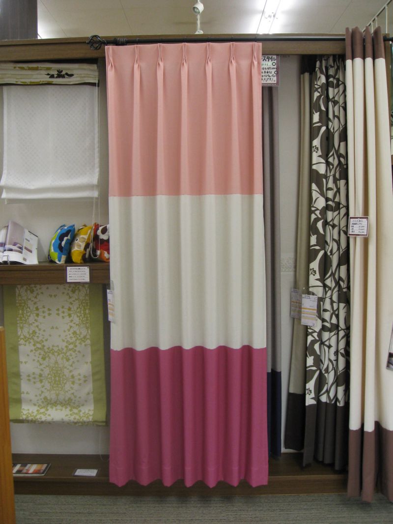 サンプルカーテンで使用した生地はこちらです。こちらの色での組み合わせでも色々できますね。ボーダー製作は大体のカーテン生地で作ることは可能ですが、作りにくいといえば横に生地が伸びる生地などは製作しにくいですね。あと生地の素材が違うもの(洗濯表示が違うもの)などで組み合わせはお客様が洗濯することを考えると素材の縮み方が違うのであまりおすすめできませんね。