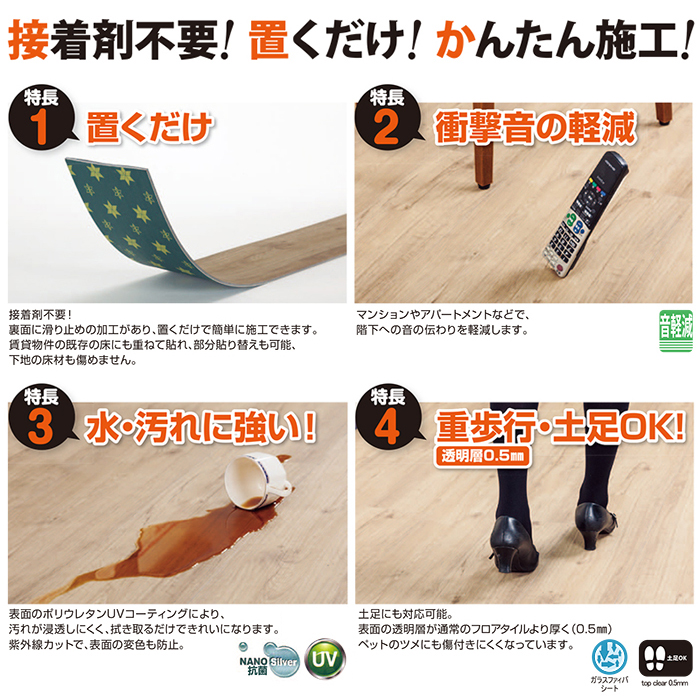 この手の商品は数点ありますが、大きな違いが色の数と表面層のプリントコーティングの厚みが厚いために土足でも歩行が出来ます。表面のプリント部分が薄いと土足では色が剥がれてしまいますので、土足歩行には適しませんが、この商品は土足もOKですので、一般の木造住宅の床やRC鉄筋コンクリート構造の床、