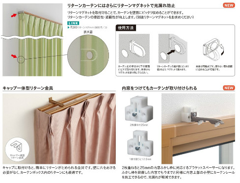 最近は省エネブームもあって冬場の窓辺からの熱の逃げを防ぐことに関心が高まっており、通常のレールの上にカバーを付けるものが出てきております。トーソーのネクスティなどにカバートップ使用などのオプションパーツがあります。