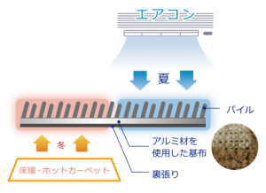 また、こちらの商品は、パイルと裏張りの間にアルミ材を使用しているため、冬は床暖・ホットカーペットの熱源で暖かさが長持ちし、夏はエアコンの冷気を、長時間保持します。