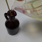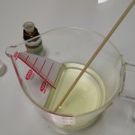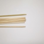 まず、竹串の先のとがった部分は切り落とします。次に軽量カップに無水エタノールとアロマオイルを9:1で入れます。(調べてみたら9:1や8:2で作るとの情報をみましたので、香りの強さは好みの比率でよいのだとおもいます。)エタノールとアロマオイルは簡単に混ざり合いました。混ざったら瓶に移します。アロマオイルの香りが薄いとエタノール臭のほうがきつかったです。