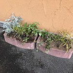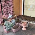 花壇ってなぜか毎年土が減っているんですよね、なので土と肥料を混ぜておいて前回の冬を無事に越した植物でまとめたプランターを作りました。相変わらず配列のセンスが見当たりません。
