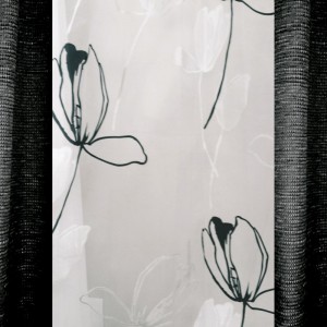 それでは本日最後のご提案です。かっこいいと思って真っ黒なカーテンを購入したら暗幕みたいになってしまった。主人が夜勤なので真っ黒なカーテンにしたら暗幕みたいになってしまった。ここで私が言いたいのは、黒いカーテンは暗幕のようになる可能性と常に隣り合わせだということです。(生活感のない無機質なお部屋には良いかと思います)そんな時にはこんな大きな柄の入ったレースカーテンを買い足すのはいかがでしょう。