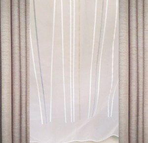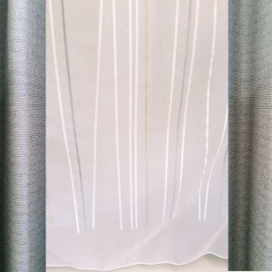 次は棒の刺繍のレースカーテンです。こんな時代なのでストレスで太ります。短い夏が終わるとすぐに食欲の秋がきます。年末年始はモチとコタツで正月太り。せめてカーテンにはいつでも縦長シルエットでいてもらいたいですね。