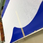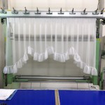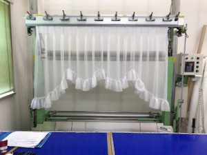 フリルを作ったら本体生地をMの形に切り落とします。・・形は仕上がりサイズによって空き方が違うので型紙を作ります。このロックミシンとフリルミシンが重要です。しかし普通のミシンと違って稼働率が悪いのが欠点です、もっと皆様スタイルカーテンのご注文お待ちしておりますね。