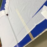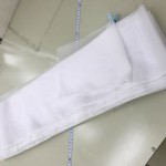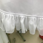 フリルと本体を合体させたら丈を決定してカットしていきます。丈の決め方は作業台の上に置き裾を型の通りに置いてからメジャーではかって印をつけています。そのあと芯地をつけ山を作って出来上がりとなります。