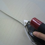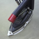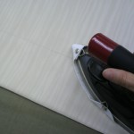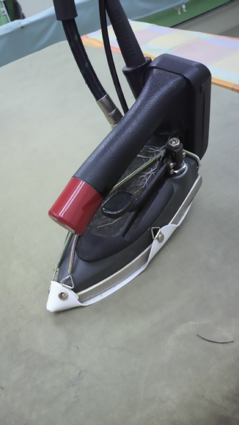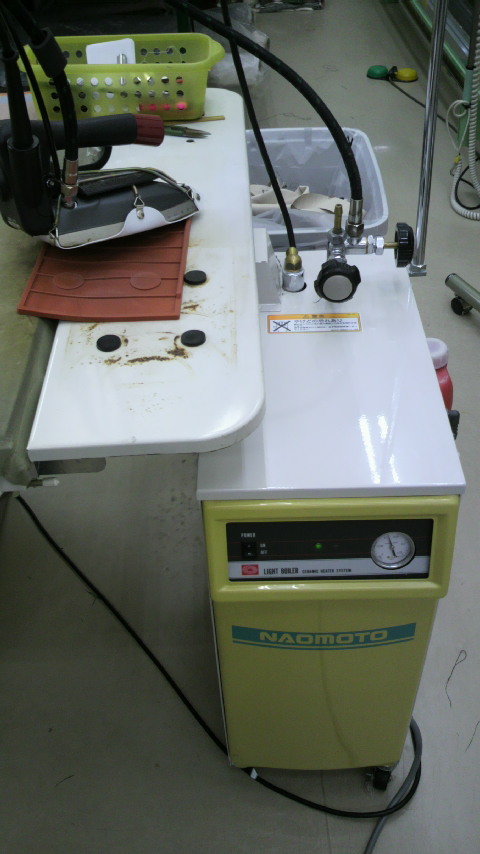 このアイロンで一番家庭用と違うのはなんといってもスチームです。アイロン用に小型のボイラーで蒸気を作っていますので威力が違いますね。アイロン取っ手の横に丁度右の親指で押せるところにレバーついていて押すとスチームが出るようになっています。写真を撮るのを忘れてしまったのですが、アイロン台も家庭用と違っています。アイロン台がバキュームになっていましてスイッチを押すと空気を吸い込みそのことで生地を固定するのとアイロンの熱が生地にこもらない様にする二通りの役割りをしてくれます。