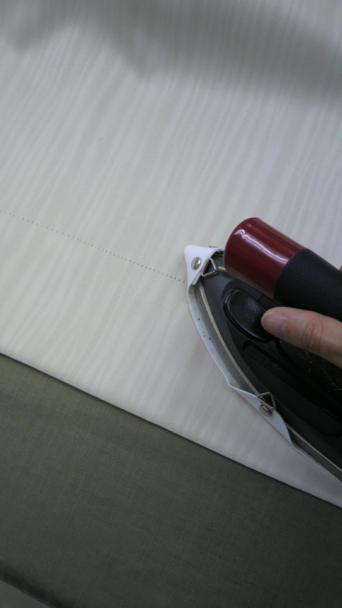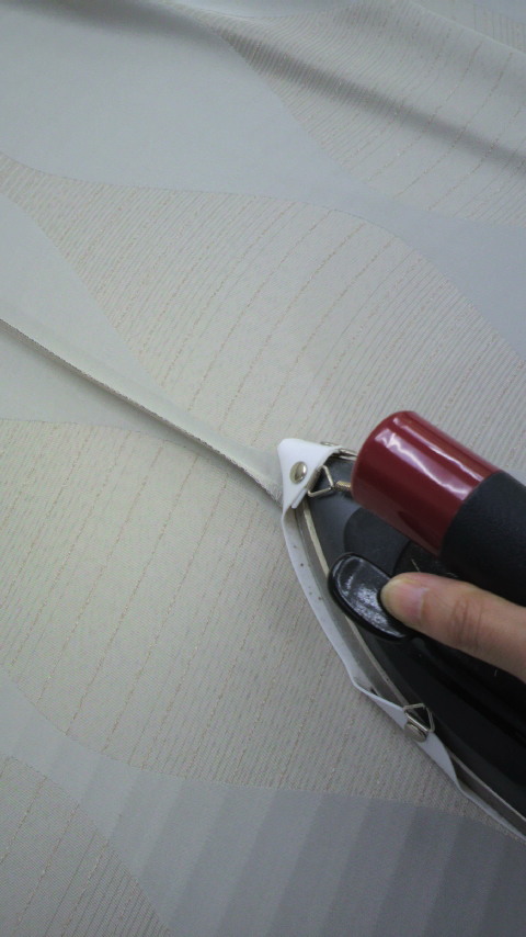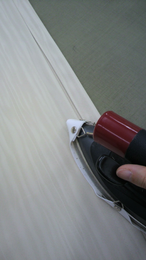 アイロンは縫製をした箇所、巾継ぎ・芯付けの後、裾・耳縫いの後、にかけます。アイロンをかけることで折り目がしっかりつく事と縫ったあとのつれを伸ばします。本縫いミシンの作業をした後のアイロンでアイロン作業が終わりますが、生地反にあったしわも最終的にアイロンをかけてとります。