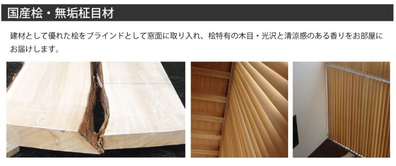 特徴は国産の杉の無垢柾目材を使用しているところです、樹齢80年以上の天然木の節の無い柾目部分をブラインドのスラットに作り上げていると事です。