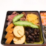 煮豆・ローストビーフ・伊達巻・きんとん風・なます風・煮物・田作りのつもりの雑魚・で完成しました。なんとかお節風になりましたね。ローストビーフやきんとん風は12月に作っておいて冷凍しておきましたし、煮豆や煮物も人用に煮ていたのを味付け前にはぶいたものなので、以外に楽でした。