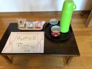 玄関に入ってびっくり。 手書きのイラストにお茶、感激しました。